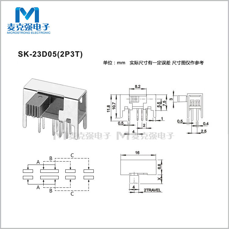 TSH horizontal handle slide switch SK23D05G6 handle height 6mm 3-speed 8-foot double row 2P3T horizontal slide switch