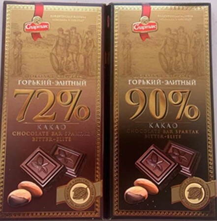 Spartak 72% Chocolate Spartak 90% dark chocolate Aksi 75% Black chocolate Aksi 85% Black chocolate Victory 72% Black Chocolate kraft 90% Black chocolate