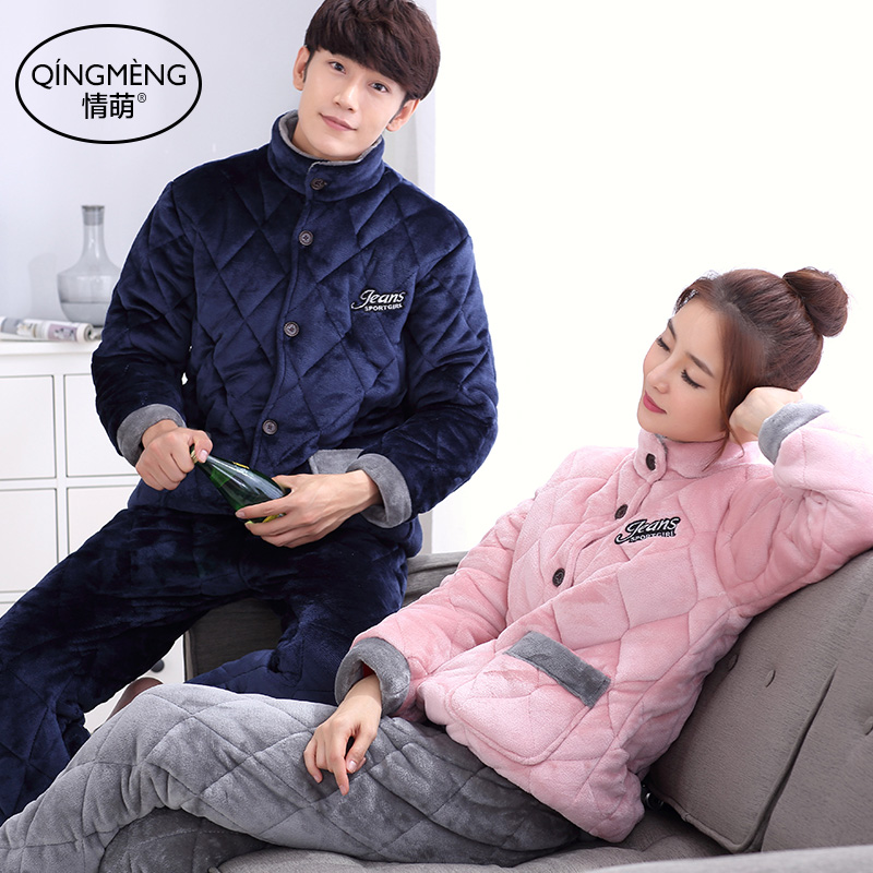 Couple pajamas women winter padded coral fleece three-layer cotton plus fat plus size winter men's warm home clothing