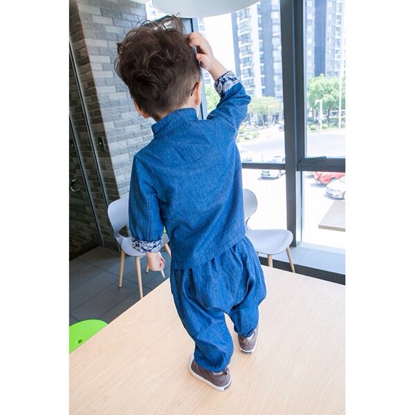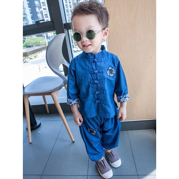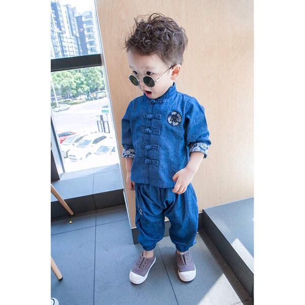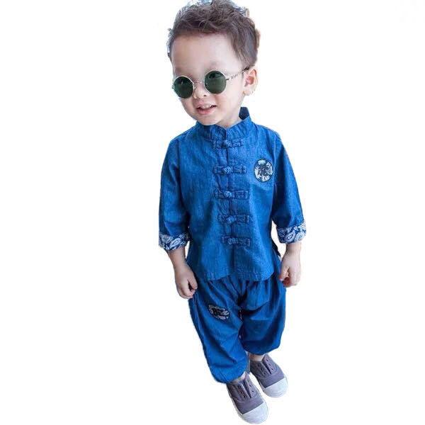 Spring Autumn New Pint Boy Ethnic Wind Denim Blouse Two Sets of Tang Loaded Baby Pure Cotton Suit Chinese