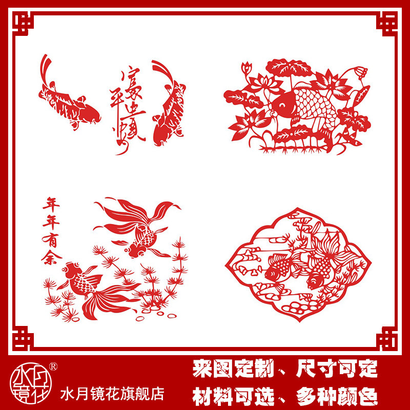 Water Moon Mirror Flower Pisces Jufu Paper-cut Sticker New Year Painting Door Sticker Decorative Window New Year Sticker Fu Word Window Flower