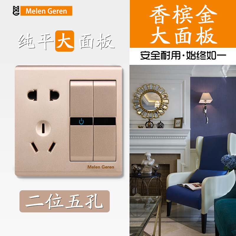 Melan Riland 86 type switch socket household champagne gold two open five holes single control two three plug with double switch panel