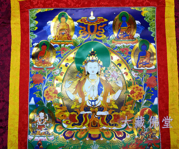 Hidden Four-arm Guanyin Tang card hanging painting 87cm Double-layer mounted Tibetan brocade Art and gold Buddha painting Decorative Painting