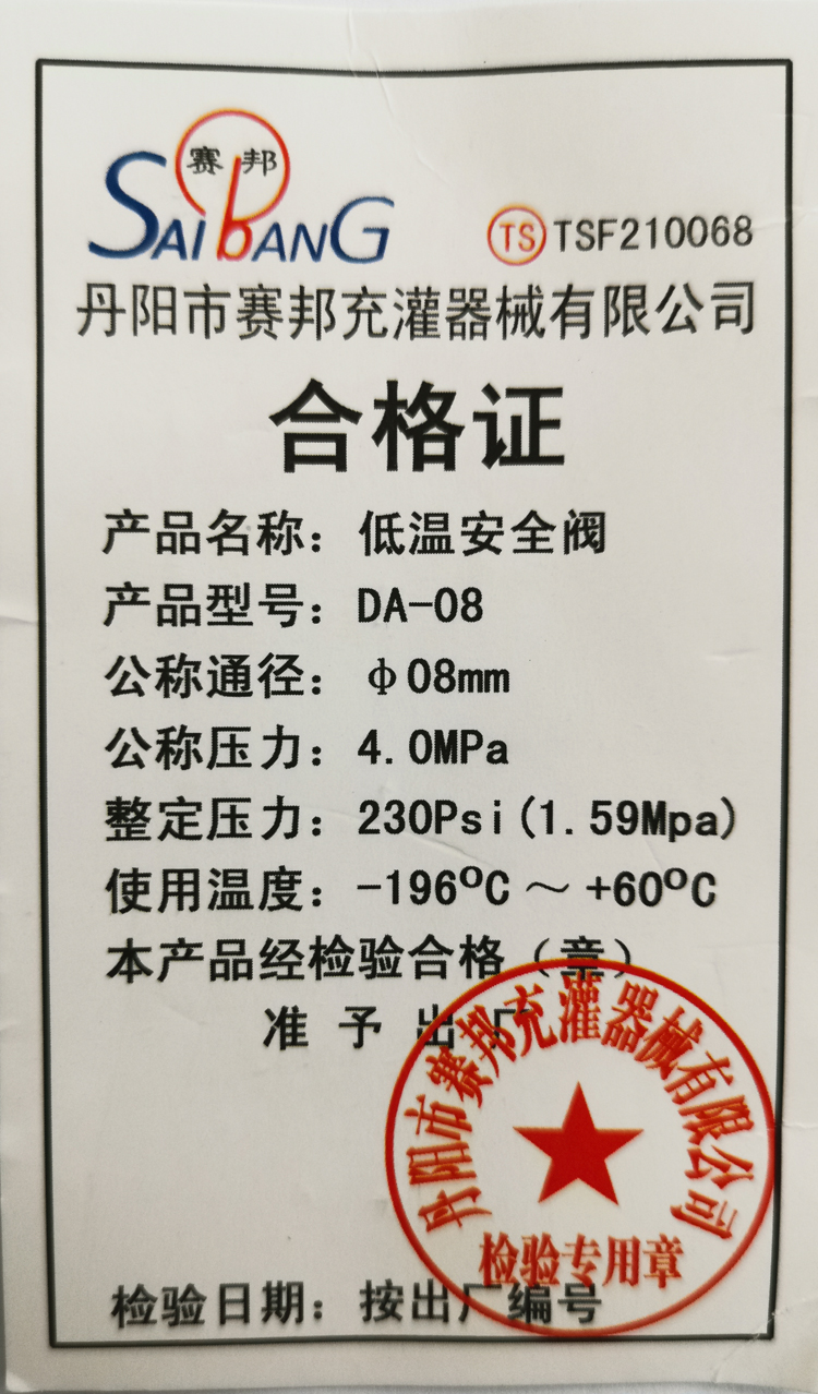 Saibang safety valve low temperature insulation gas cylinder liquid oxygen tank exhaust valve 230PSI 350PSIG vent valve high pressure valve