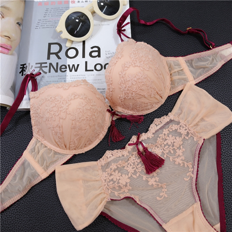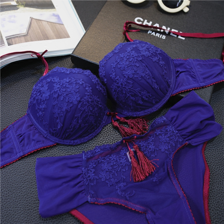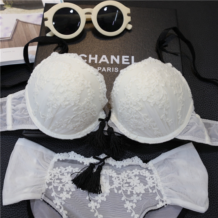 European and American high-end court three-dimensional floral tassel pendant white women's sexy underwear gathered bra set