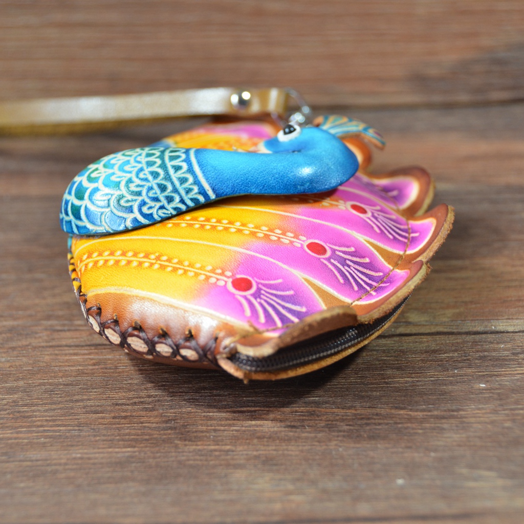 Handmade ethnic style creative small wallet coin bag cute leather coin purse girl mini bag card bag peacock