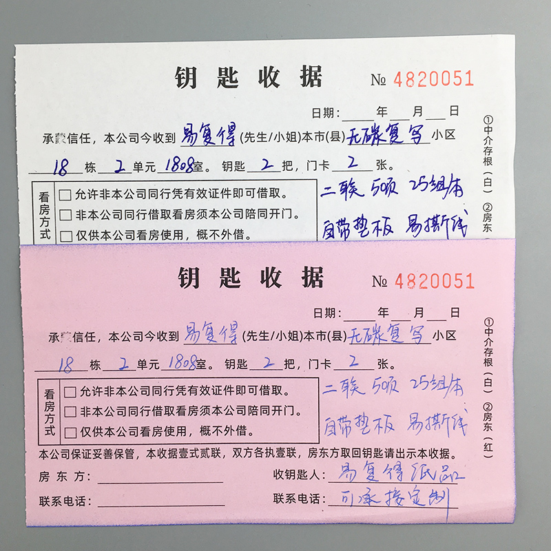 Two-part key receipt (full 20 copies) Two-part intermediary special receipt 50 pieces 25 copies This two-part Rent, water and electricity receipts 150 pieces 75 copies This two-part deposit receipt 150 each