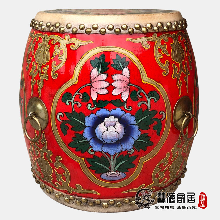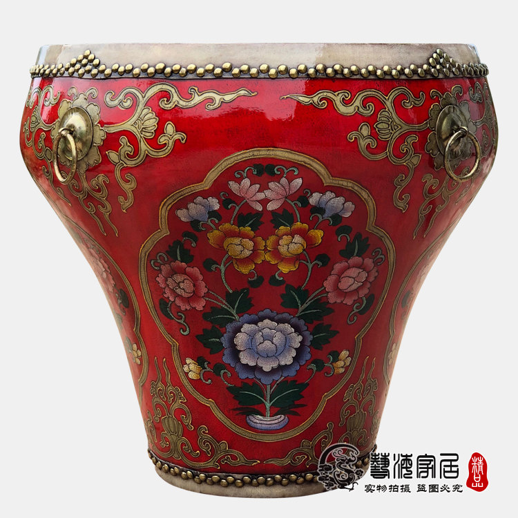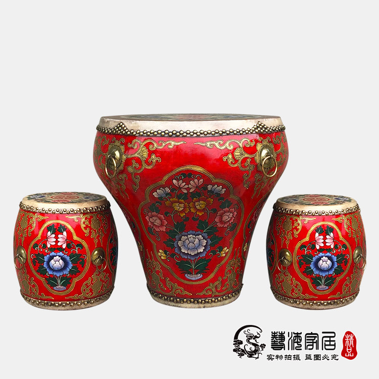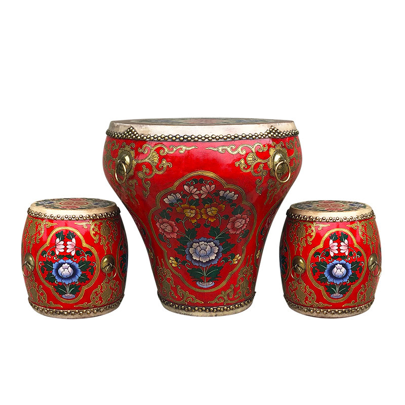 Chinese painted flower pot drum tea table drum table old solid wood cowhide hand-painted big drum round drum table table tea combination environmental protection