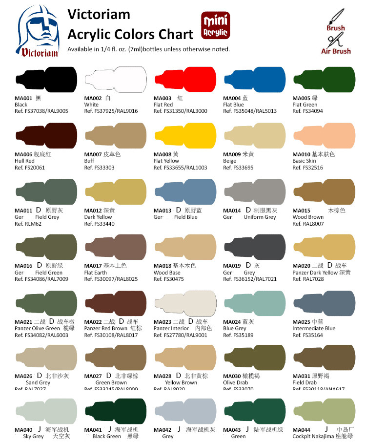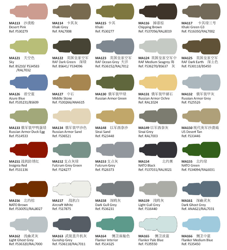 MA174 Israel Air Force Light Grey Green MA175 Israel Air Force brown MA176 Israel Air Force Shades MA190 Sea Blue MA200 Brick Red MA201 Dry Clay Color M