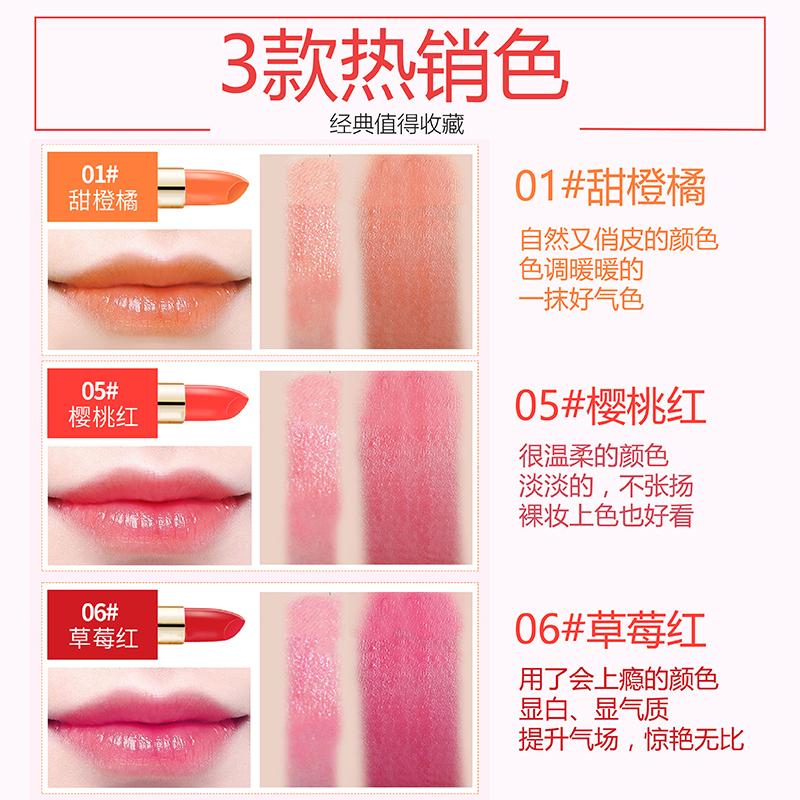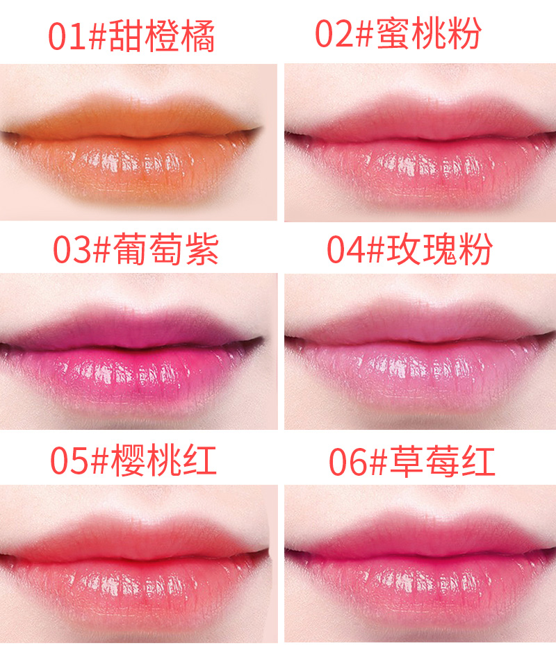 01 sweet orange orange 02 honey peach powder 03 grape purple 04 rose powder 05 cherry red 06 strawberry red