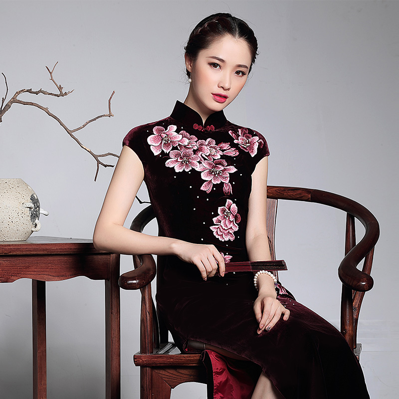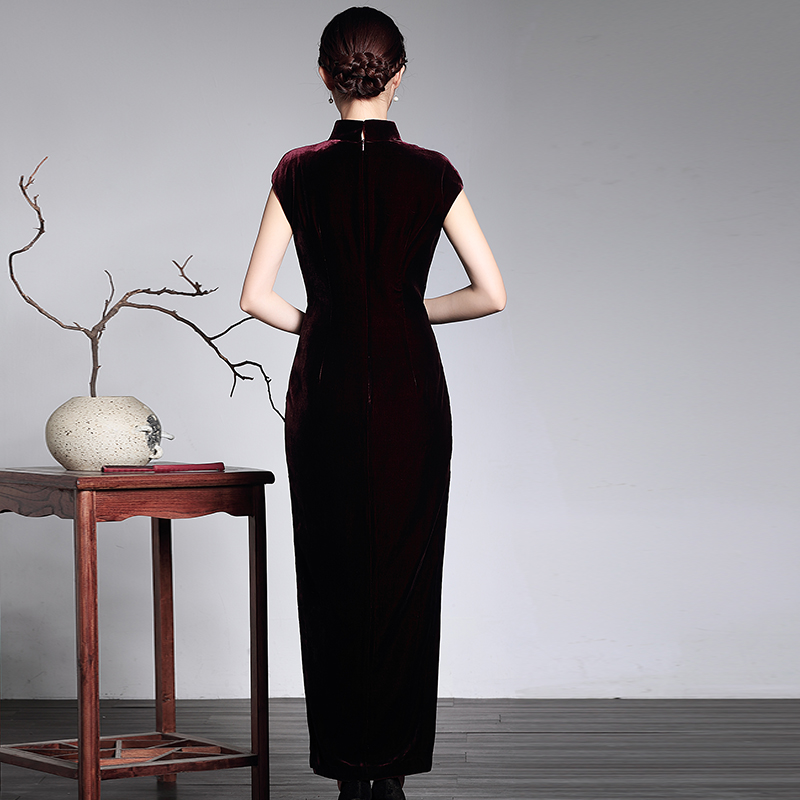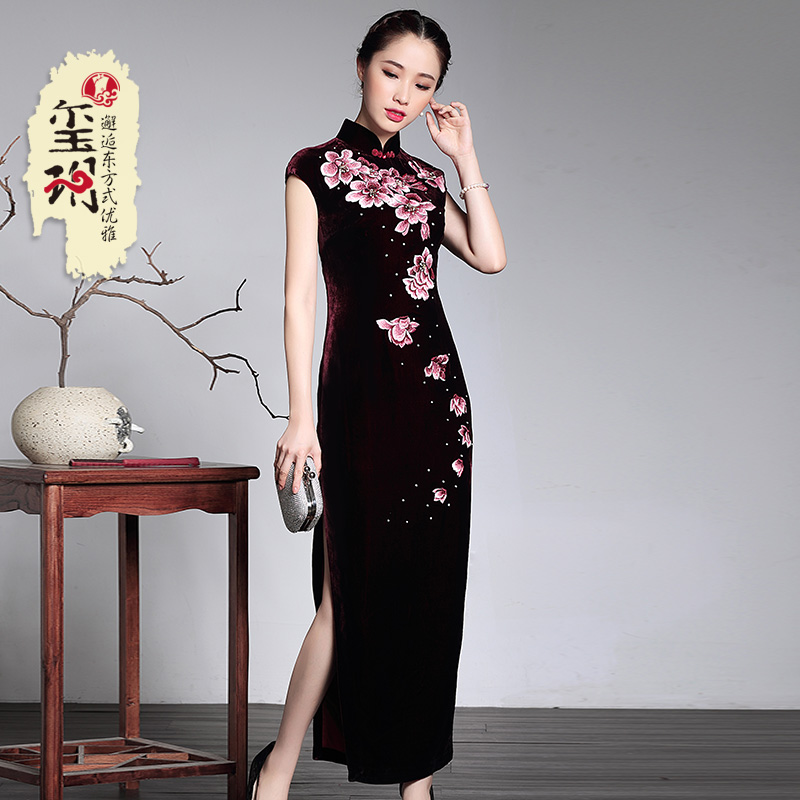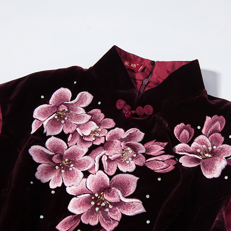 Xi Yue 2021 spring and summer new silk velvet beaded embroidery long Cheongsam wedding banquet dress mother dress