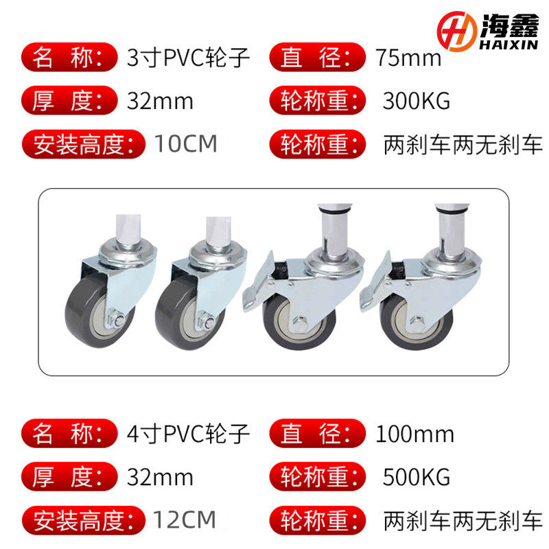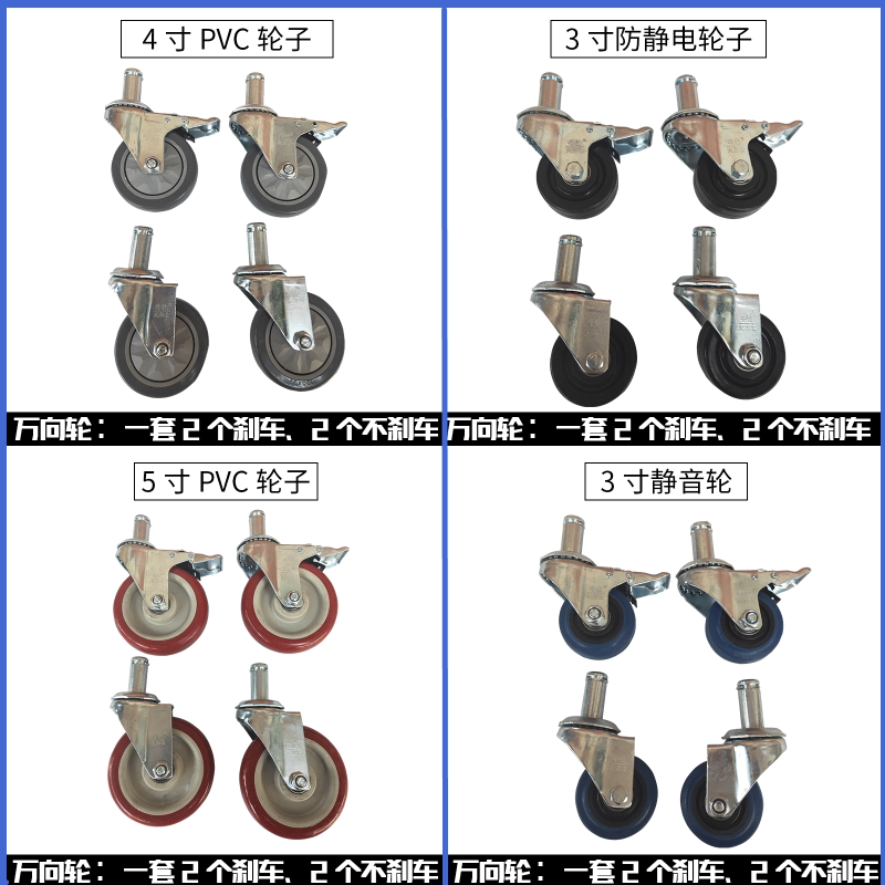 1 set of 3-inch PVC wheels (2 brakes, 2 non-brakes) 1 set of 4-inch PVC wheels (2 brakes, 2 non-brakes)