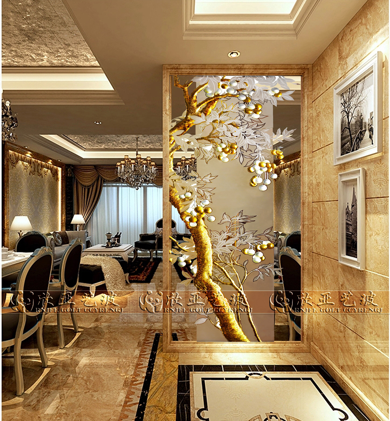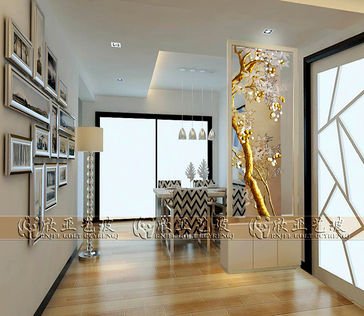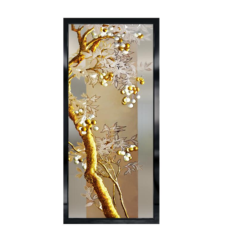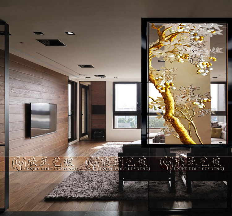 Painted Art Glass Entrance to the family Living Room Kitchen Screen Steel Frosted Frosted Gold Leaf Sculptures Flowers and Flowers