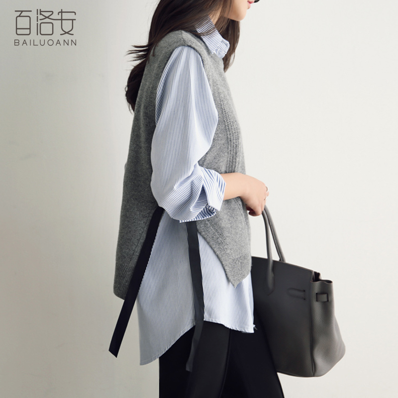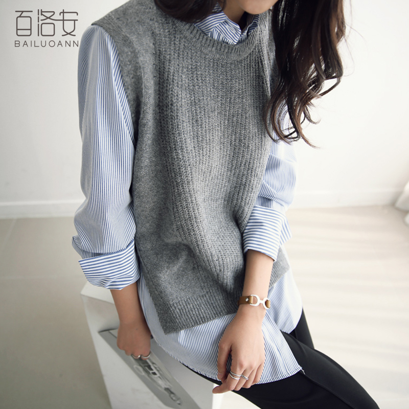 Bailuoan sleeveless pullover short knitted sweater women's autumn and winter new round neck all-match split sweater vest vest women