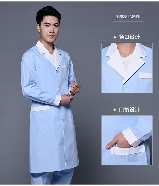 Men's blue coat with white collar and long sleeves Men's blue coat with white collar and short sleeves Men's white coat with light blue collar and long sleeves Men's white coat with light blue collar and short sleeves Men's white coat with light blue collar and short sleeves