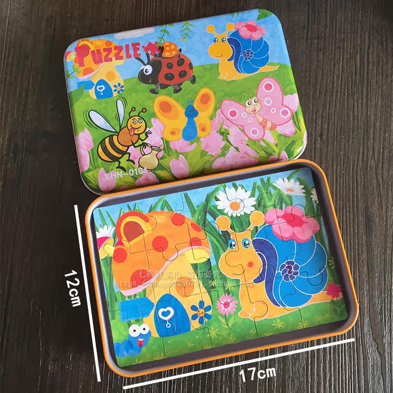 Children cartoon iron box wooden puzzle baby simple puzzle puzzle kindergarten area corner toy 2345 years old