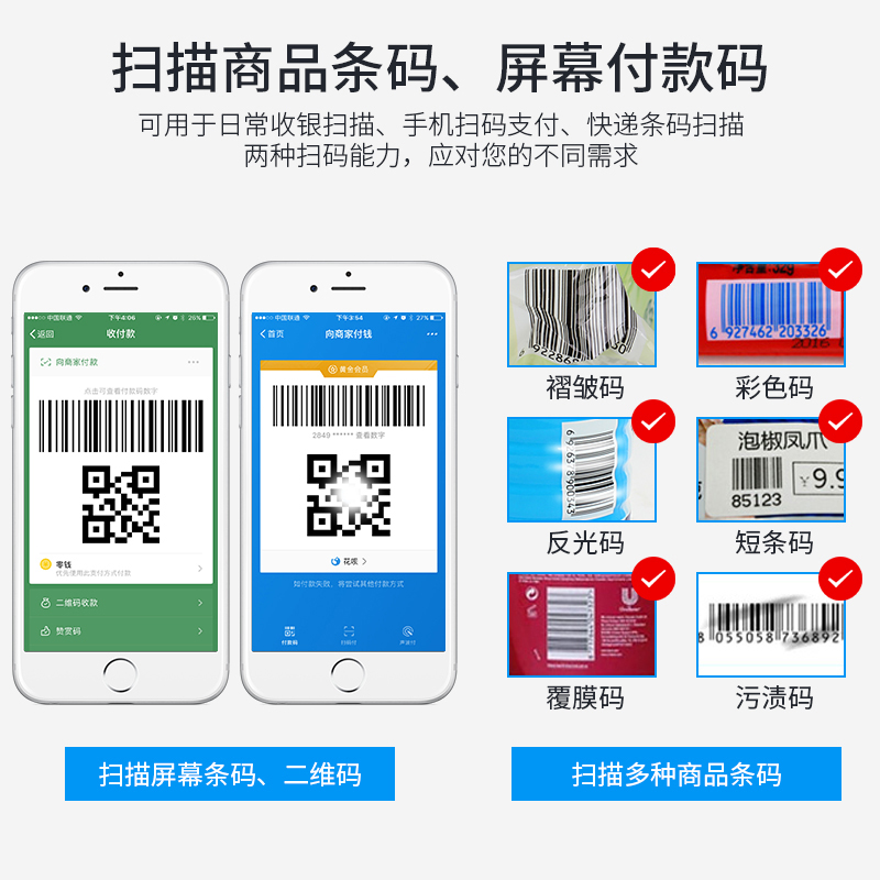Wired 1D laser scanner (suitable for express storage) Wireless 1D laser scanner (for express storage) Wired 1D red light scanner (express storage + payment cashier) Wireless 1D red light scanner (express storage + payment cashier) Wired 2D imaging scanner (suitable for mobile phone payment and various types of 1D 2D 2D scanning gun) Wireless 2D image scanning gun (suitable for mobile phone payment and various 1D 2D two-dimensional codes)