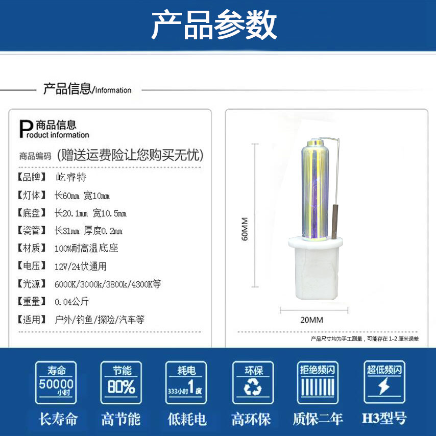 55 W 3000K (gold light) 55 W 3800K (warm yellow light) 55 W 4300K (yellow white partial red light) 55 W 6000K (white light) 75 W 3000