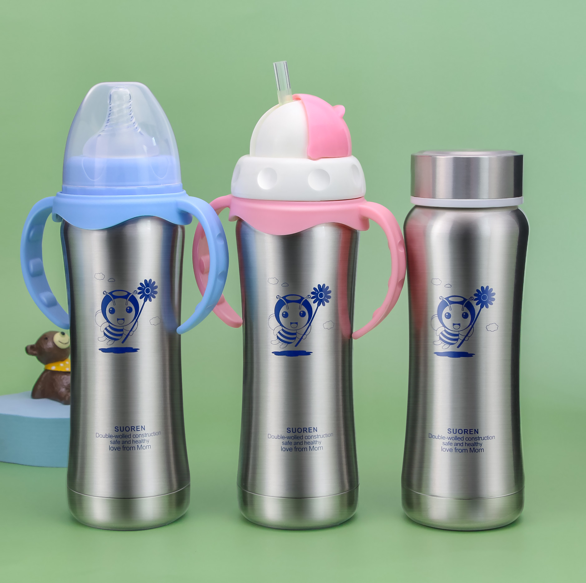 Baby stainless steel thermos bottle wide caliber newborn baby child dual-purpose thermos cup with straw handle