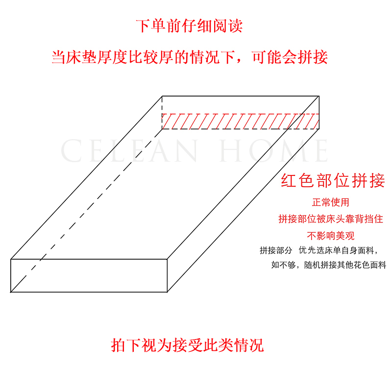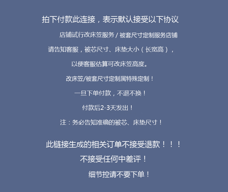 Four-corner bed sheet (four corners plus rubber band)All-inclusive bed sheet(one circle of 360 degree rubber band)Invisible bed sheet(plus edge to change the bed sheet)Quilt cover customization(big change to small) customization Non-refundable Please comply with the spirit of the contract customization