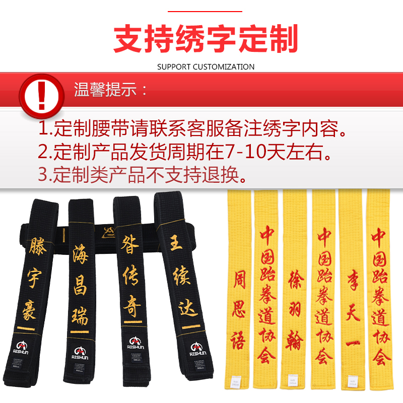 Taekwondo belt embroidered word promotion examination belt Yellow belt Green blue Red black children's competition training red belt Black belt