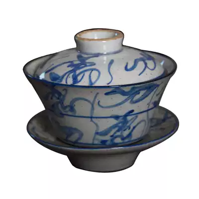 Jingdezhen ceramic tea set ancient kiln hand-painted blue and white old Camellia knife pattern Grass Wood ash three Cai Bowl single Tea Bowl