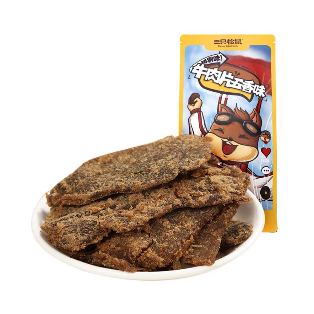 Three squirrels beef beef dry beef slices 100g hands ripping five scents of savory spiciness and spicy notes of a little bitty snack snack