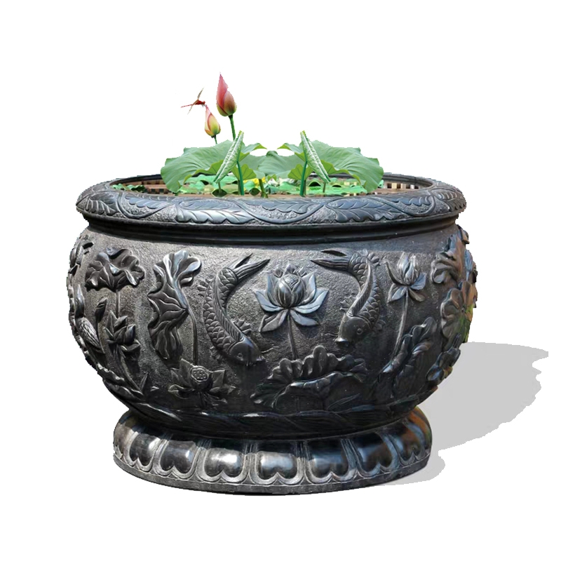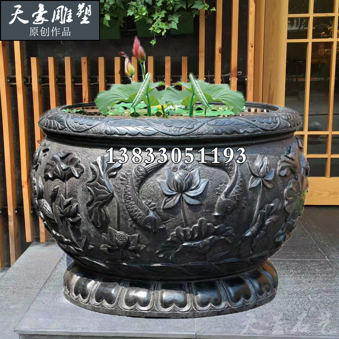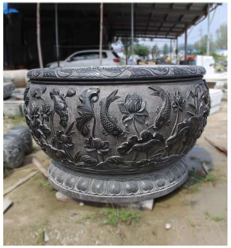 Finely Carved Stone Carved Fish Tank Green Stone Head Made Old Lotus Flower Raising Fish Pond Feng Shui Cylinder Courtyard Flower Pot Hanbai Jade Black Pendulum Piece-Taobao