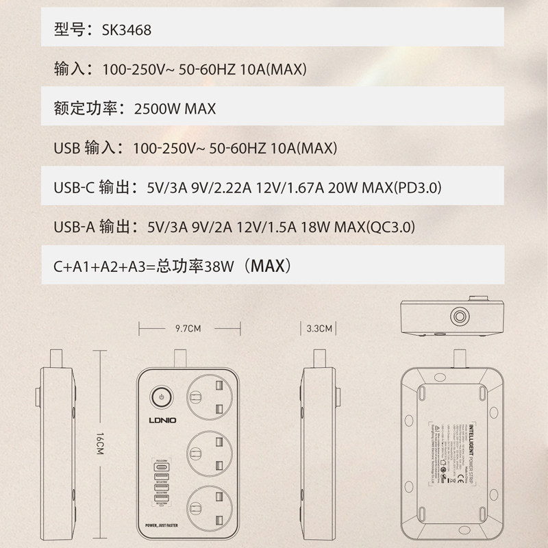 Lidenau platoon LDNIO Meiying Europeub inserts Hong Kong version usb socket extension cord with 6usb charge
