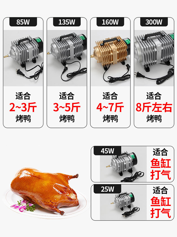 85w (suitable for 2-3 kg roast duck) 135W (suitable for 3-5 kg roast duck) 160W (suitable for 5-7 kg roast duck) 300W (suitable for 8-10 kg roast goose) 30w naked pump (fish tank pumping) 45w naked pump (fish tank pumping)