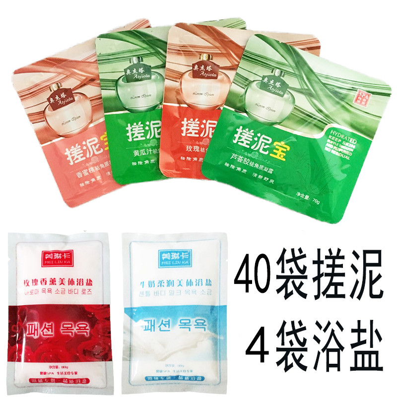 10 bags of mud rub treasure(send 2 bags of salt)45 bags(no gift)40 bags(send mask 1 body milk 1)40 bags of mud rub (send 4 bags of salt)