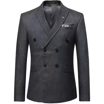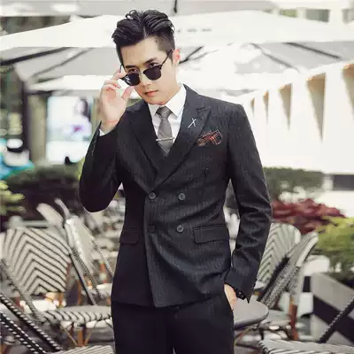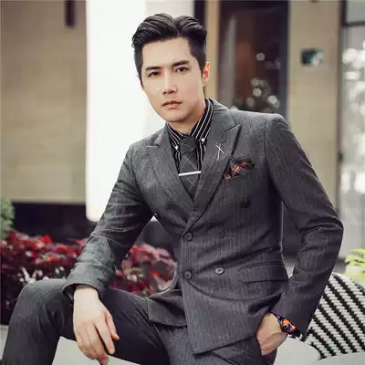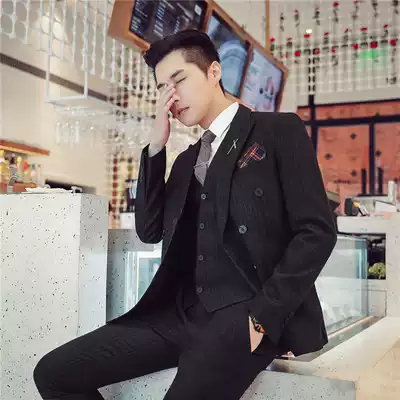 Double-breasted striped suit suit men's three-piece Korean slim-fit small suit men's suit jacket groom dress