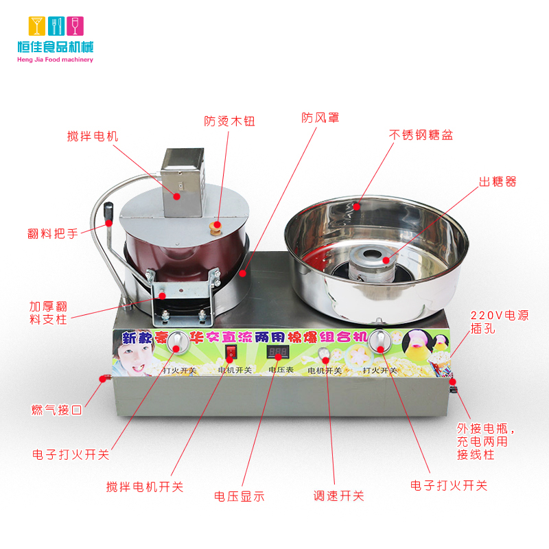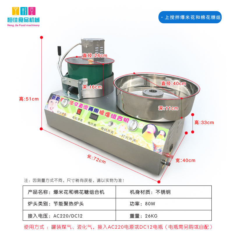 Single Pot Gas Hand-Fired Popcorn Machine Single Pot Gas Popcorn Machine (Electric Stirring) Single Pot Electric Heating Popcorn Machine (AC220V) Upstir Cotton Candy Popcorn Rice Combination Machine