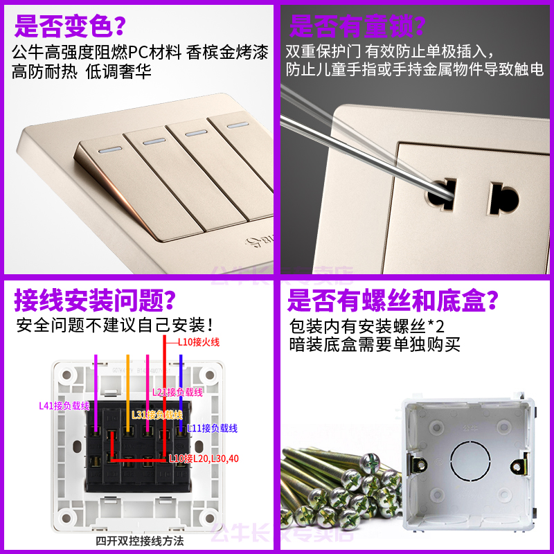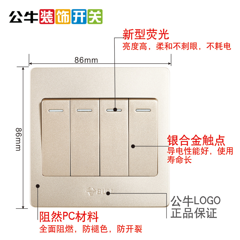 Bull Switch Socket Power Wall 86 Type 4 Open Double Union Home Four Open Double Cut Switch Panel Champagne Gold