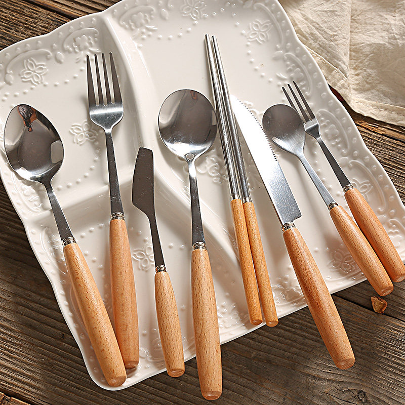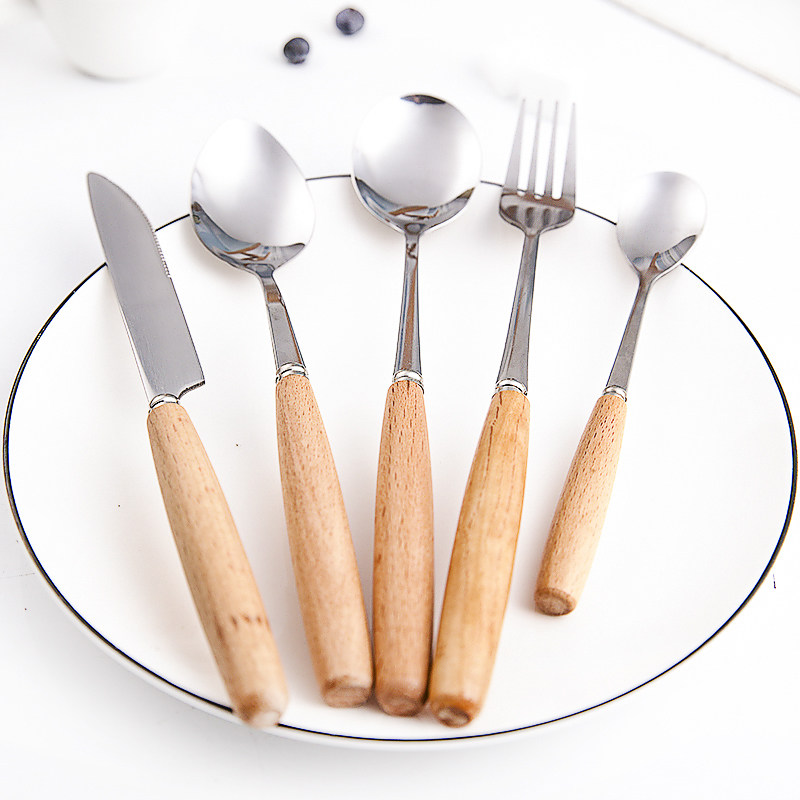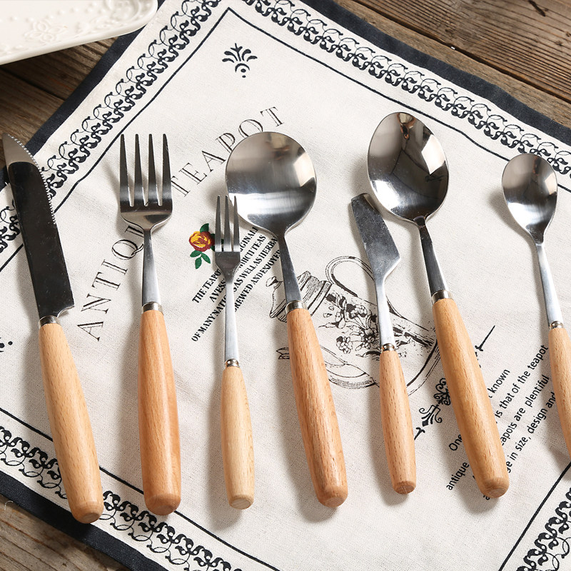 Beech Wood Handle Stainless Steel Steak Western Dining Knife Fork Spoon Fruit Fork Dessert Knife Sweet spoon Stir Soup Spoon