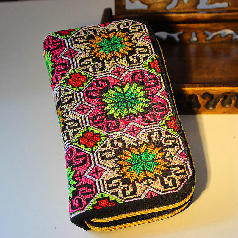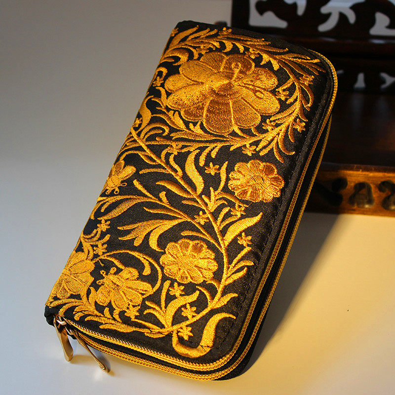Original Embroidered Flowers National Wind Long Version Wallet Card Ticket Bag Mobile Phone Bag Double Lady Handbag handgrip Handle Bag