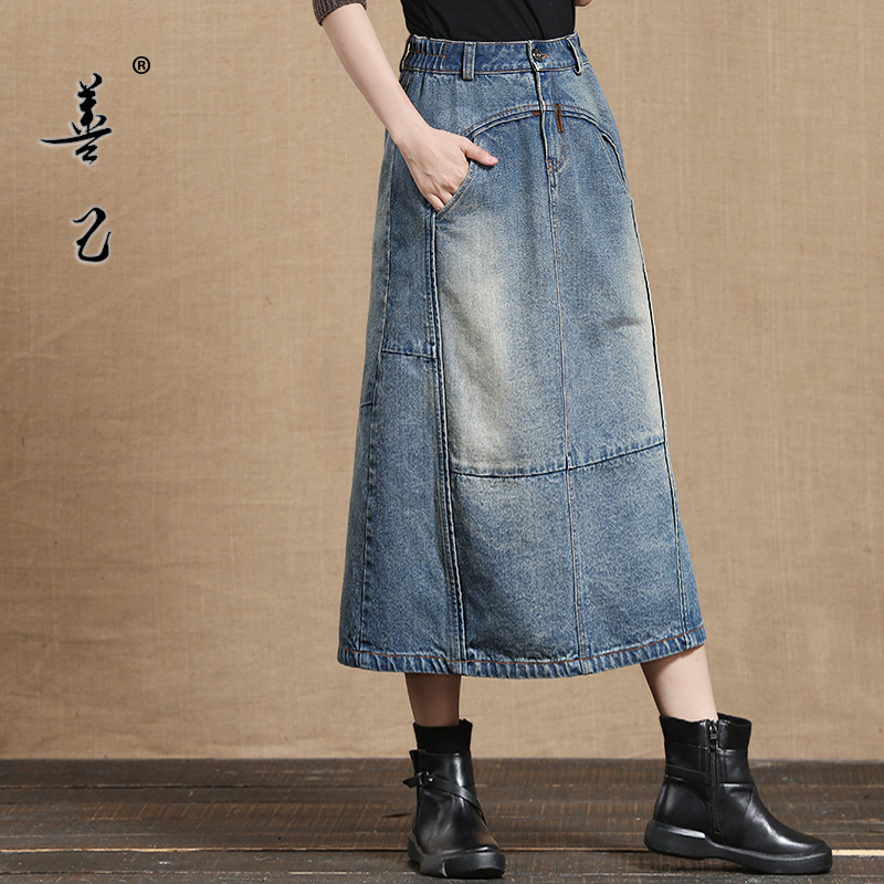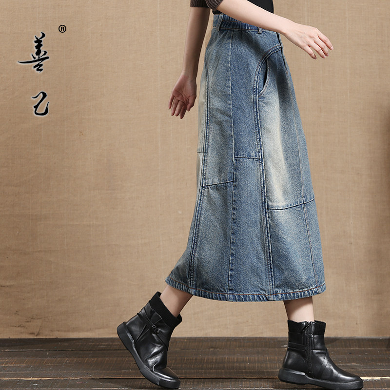 Shanji 2021 spring denim skirt women's retro stitching denim skirt medium and long version A-line skirt literary skirt tide