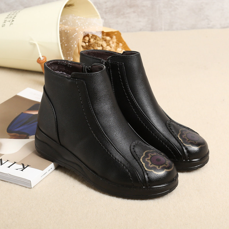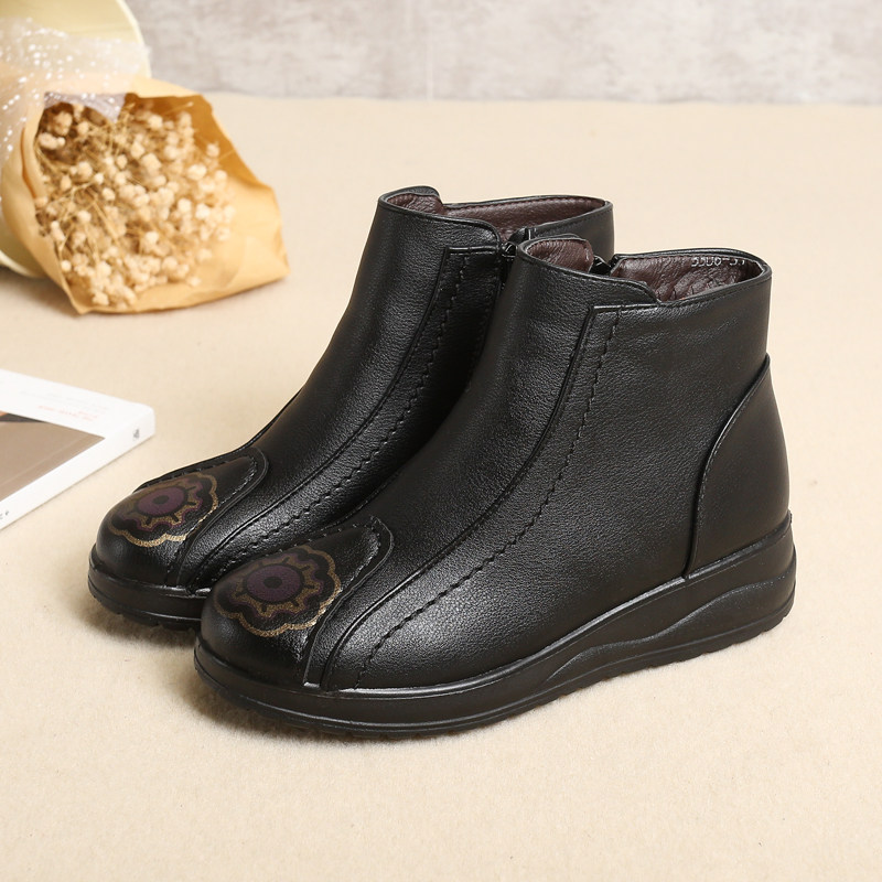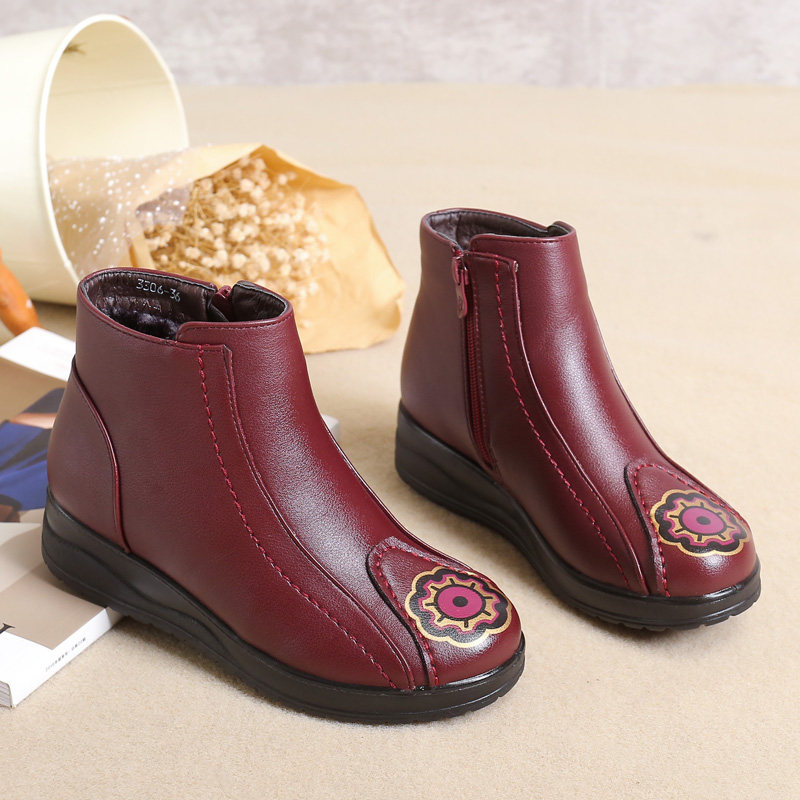 Middle-aged and elderly women's shoes winter mother shoes cotton shoes ethnic style non-slip elderly shoes plus velvet warm grandma leather shoes short boots