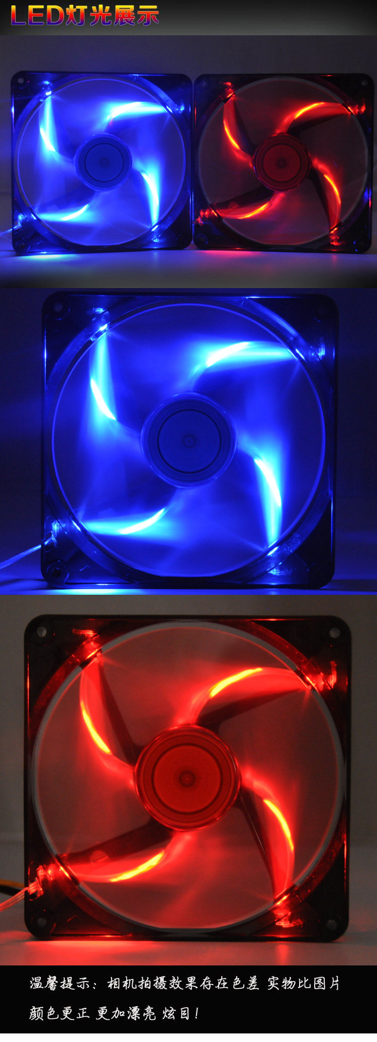 Black frame Red fan blade Red light black frame Light blue fan blade Blue light Black frame White fan blade Blue light