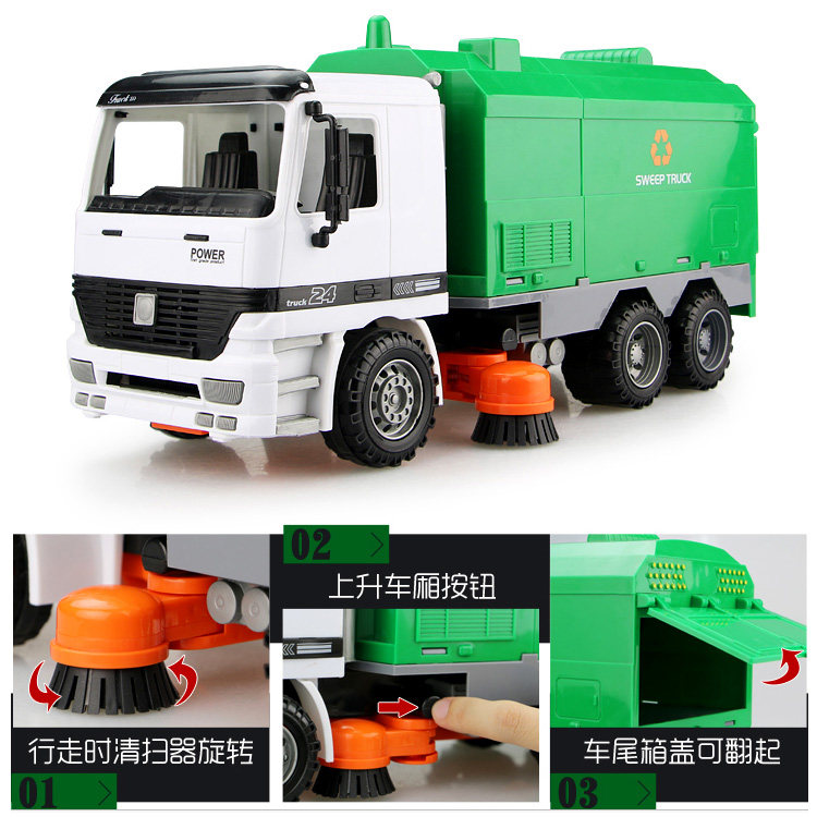 The regular section sweeper (broom will turn) the sound and light style sweeping car (broom will turn) the upgraded version of the sweeping car (the broom will turn) the green inertial tipping bucket (one-key skip) yellow Inertial Tipping car (