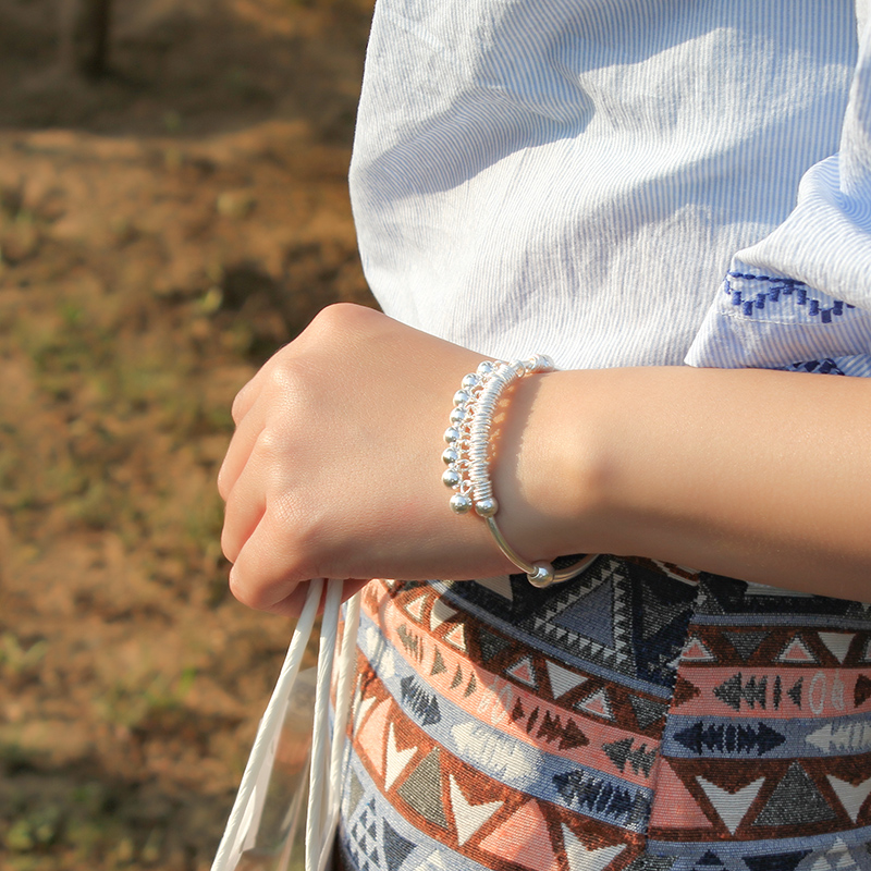 Jiuxi Silver Building S990 silver girl Bohemian silver bracelet pure silver bell bracelet push and pull silver bracelet silver ornament