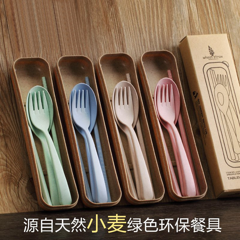 Environmentally friendly degradable wheat cutlery set creative student portable travel chopsticks spoon fork three-piece set