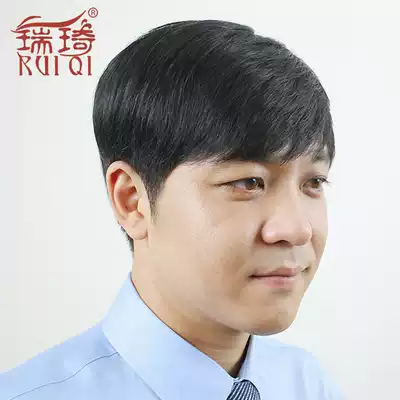 New middle-aged and elderly men's short straight hair real hair male wig middle-aged man short hair whole hand knitting needle oblique bangs