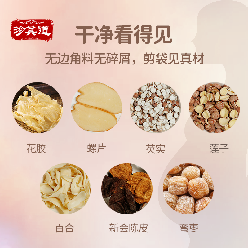 Conch slices (dried conch meat) Flower glue (dried fish kingfish) Lotus seed gorgon Honey jujube Lily Tangerine peel