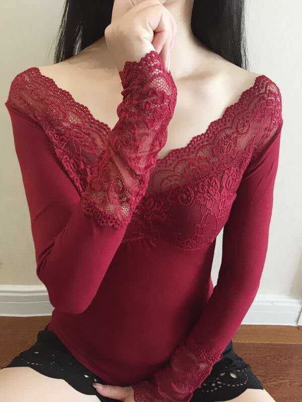 Goddess clothing pure cotton heating clothing women thin V-neck lace body shaping body clothing one piece autumn clothing tight bottoming shirt