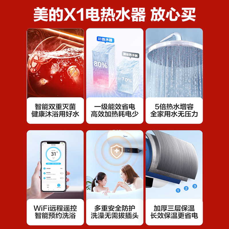 Midea Smart Electric Water Heater 60L Household Energy Saving Water Storage Type Fast Heat Level I Energy Efficiency Makeup Room 50L Bath