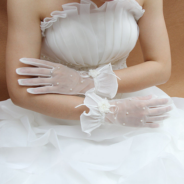 Bride Wedding Yarn Gloves Short Han Wenjing Star Identical Dress Accessories Han Style Lace Pearl Gloves White