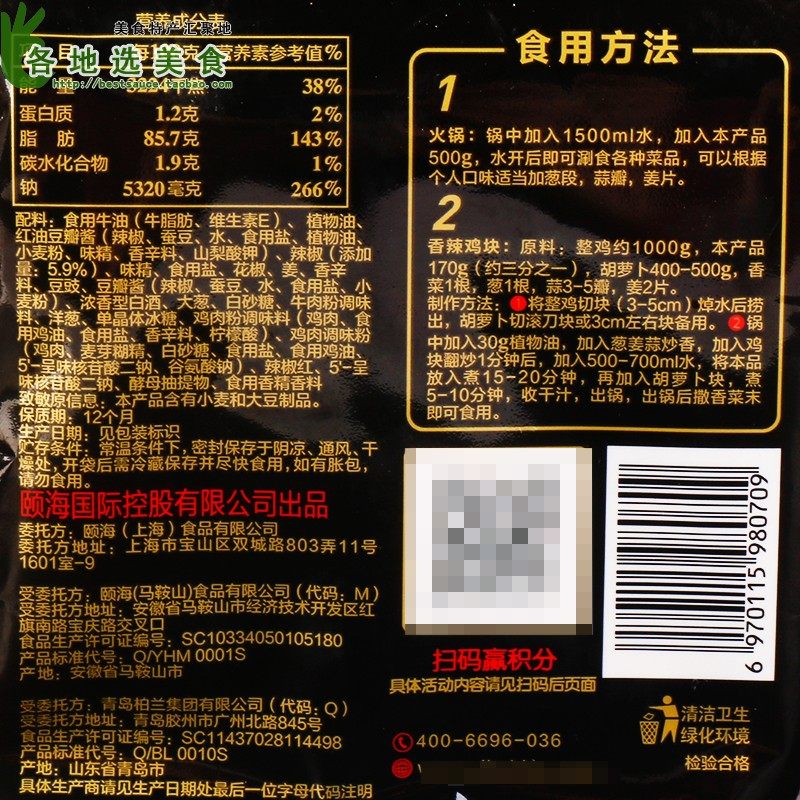 Edible butter (bovine fat vitamin E) Vegetable oil Red oil Bean paste (chili broad bean water Edible salt Vegetable oil Wheat flour monosodium glutamate spices Potassium sorbate) Pepper (addition