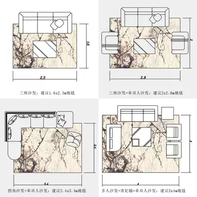 1 6 meters×2 3 meters Suitable for use with 2-seater sofa 2 meters×2 8 meters Suitable for use with L-shaped sofa 2 4 meters×3 3 meters Suitable for use with L-shaped or U-shaped sofa
