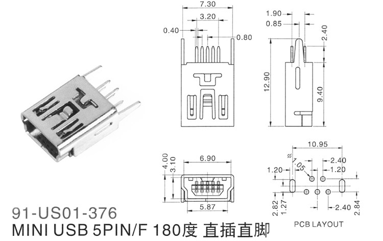Mini USB 5P Straight Pedestal Connector 5 Female USB Interface Mini USB 180 Degree Insert Plate All Copper
